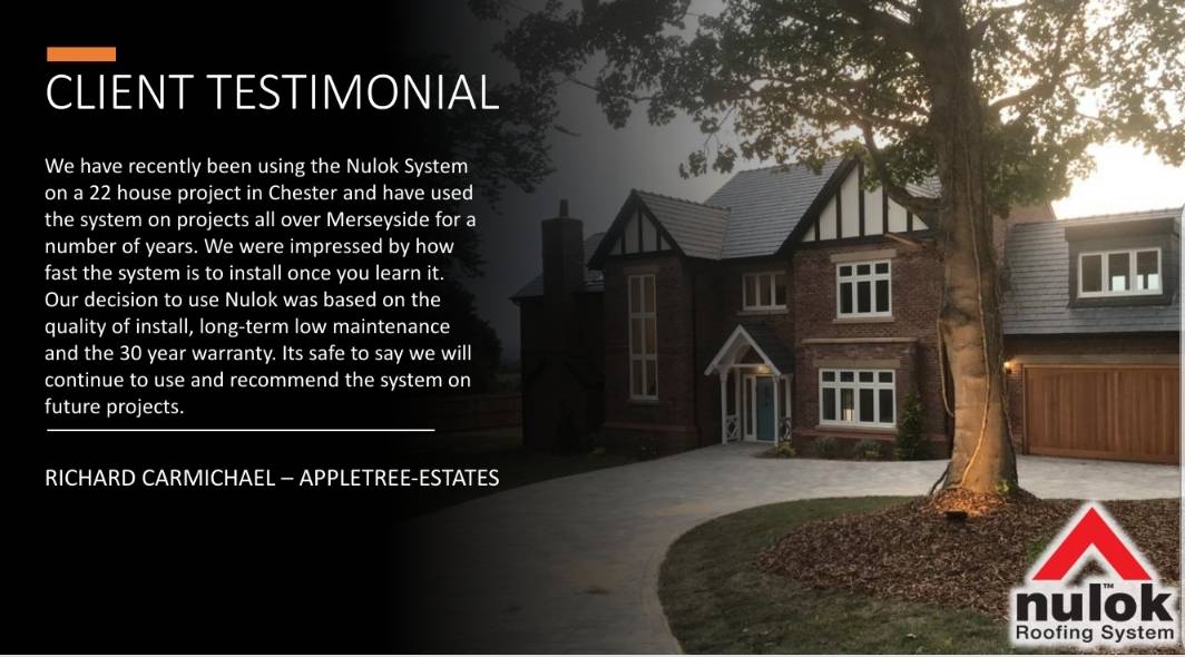 The nulok roofing system offers a highly efficient method of installing natural slate nulok solar inserts and ceramic tiles. Over the past 10 years we have enjoyed seeing our client s faces when they see the finished product and know that their investment has been well worthwhile. 10 years on when we speak to some of our first clients it is great to hear that they still take pride in their nulok roof.